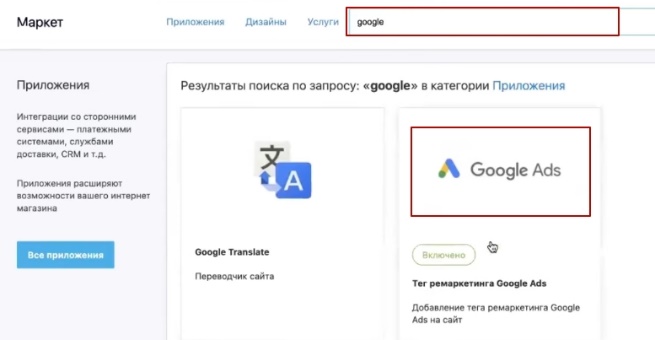 Здесь открывается новая поисковая строчка. Вы вписываете хотя бы Google. Просто Google вписываем. И вот видите Google Ads, эта штучечка. Вот то, что нам нужно. Она уже в этом интернет-магазине добавлена из Маркета.