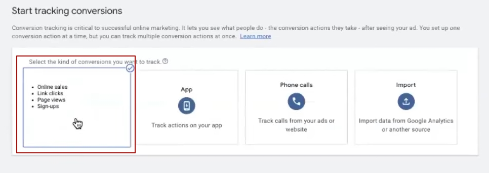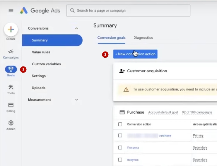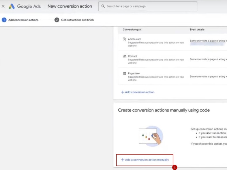 Вот переключилась и теперь мне нужно нажать это «Add a conversion action manually». Я есть вручную создать это второй блок.