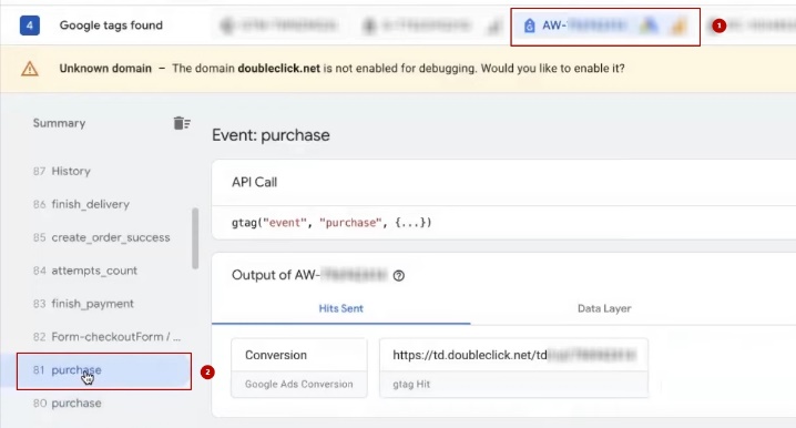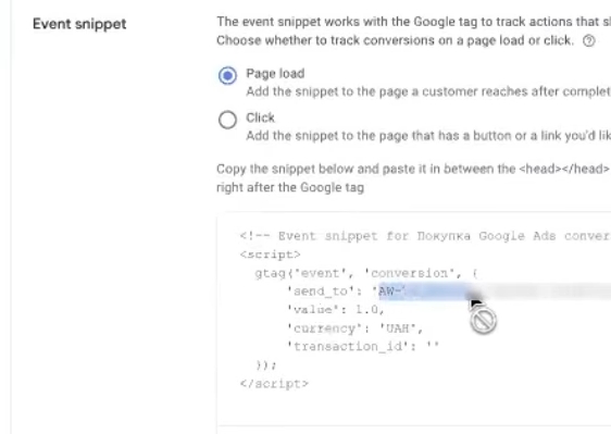 Нам нужно найти, чтобы вот здесь где-то был код Google Ads. Значит мы попробуем второй этот event. Нажимаем conversion. И о замечательно, смотрите, здесь у нас будет что? Вот наш Conversion Label. Метка, которую мы вот, если я скопирую ее отсюда, вернусь в Google Ads или наоборот нажму Ctrl+F, вот она у меня полностью сходится.