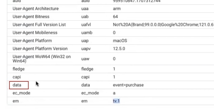 Если вы их нашли, далее вот тут, вы хотя бы предположительно пытаетесь найти event, называемые purchase. Видите, purchase – покупка? Нам важно найти этот purchase. Вот если это 80-й, мы его открываем здесь у нас. Четвертая аналитика нам нужна. Это нам не подходит.