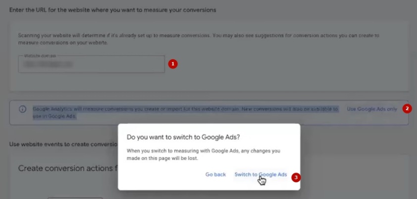 Выбираем вебсайт обязательно. Нам нужно вписать доменное имя нашего сайта. Мы писали. «Сканировать». Мы вот тут смотрим, у нас есть такое вот уведомление. Здесь будет написана Google Analytics, будет измерять конверсии. Новые конверсии будут использованы в Google Ads. И я хочу Google Ads Only. «Switch to Google Ads».