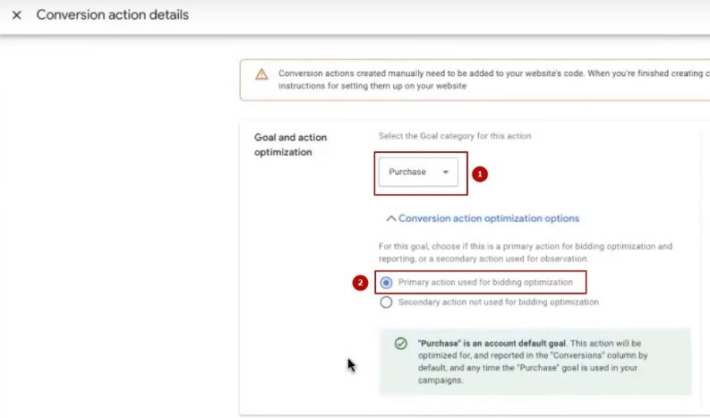 Далее обязательно выбрать «покупку». У меня на английском просто называется purchase. У вас это будет покупка. Обязательно, обратите внимание на главное действие или второстепенное, второстепенное или основное. В чем разница между ними? Если мы оставляем эту конверсию в основных, то она будет учитывать в столбце базовые конверсии для оптимизации стратегии ставок любая рекламная кампания. Если вам не нужна эта конверсия или вы там будете параллельно как-то отслеживать, то выбирайте primary. Secondary – это второстепенное действие. Я оставляю их основным.