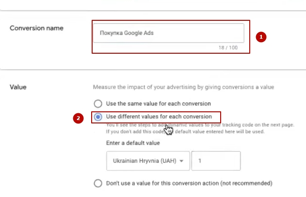 Далее я ее называю «Покупка Google Ads». Далее выбираем «Использовать разную ценность для каждой конверсии». Здесь можно ничего не менять. Почему этот блок? Для того чтобы у нас динамически передавалось разный доход в зависимости от стоимости товара, в зависимости от количества товара и прочее.