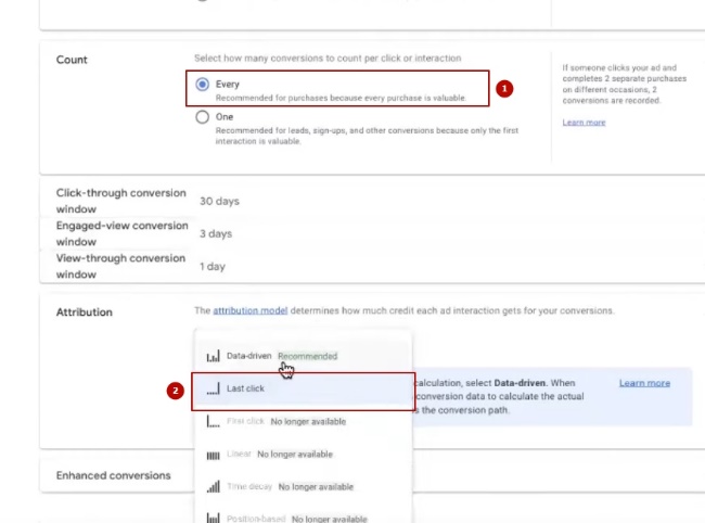 Подсчет – это каждая конверсия. Это непременно. Мы оставляем здесь. Мы практически ничего не меняем. Единственное, что я бы вам рекомендовала, до тех пор пока вы не соберете там конверсии 200-300 и даже 500, можно сидеть на последнем щелчке модели атрибуции. То есть у вас здесь автоматически включено «На основе данных». А я вам предлагаю «Last click», то есть последний клик.