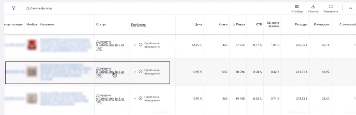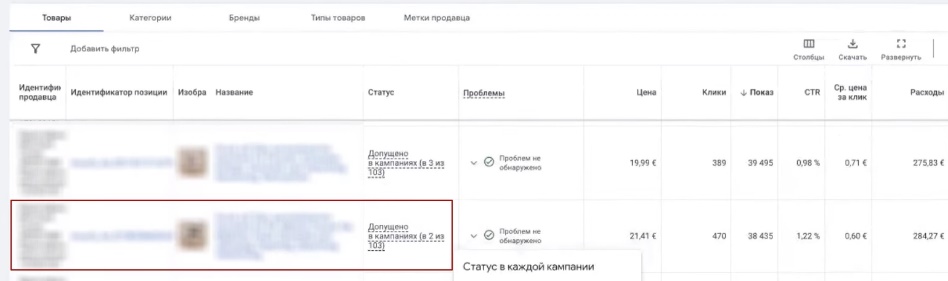 Это же самое можно посмотреть в другой товарной позиции. Вот, например, возьмем этот товар. Берем, например, вот третью кампанию. Он активен в трех кампаниях.