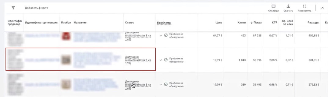 Берем топовую рекламную кампанию, а тут как раз наоборот. После начала поднятия рентабельности эта товарная позиция перестала быть эффективной. Например в данном случае в этой топовой кампании стоит исключить эту товарную позицию в отличие от других кампаний.