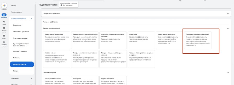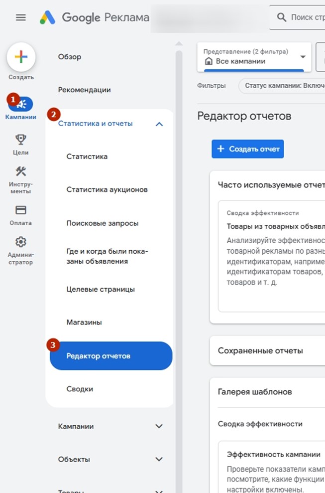 1. Заходим в кабинет гугл адс. Переходим в раздел Кампании — Статистика и отчеты — Редактор отчетов