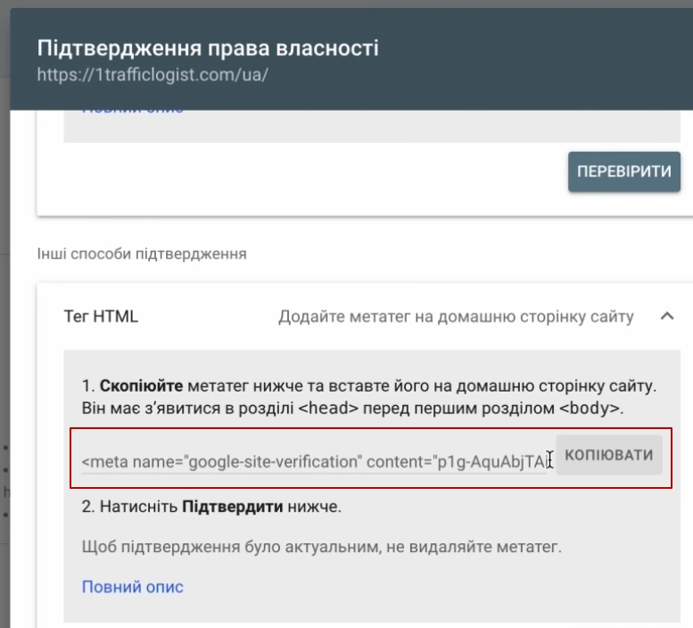 Там где префикс URL адреса вписываем наш домен, нажимаем «Проверка подтверждения». Далее мы листаем сюда, там где есть тег HTML.