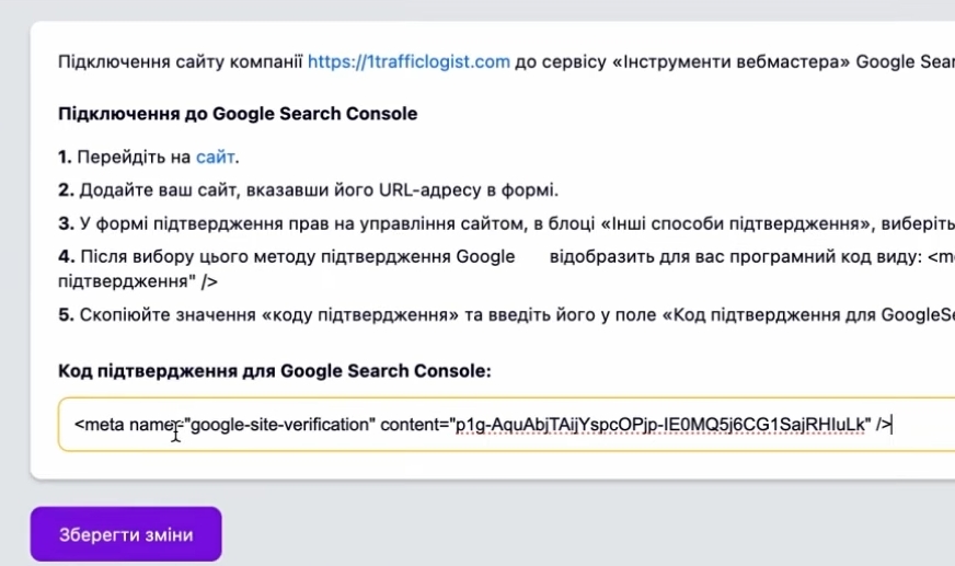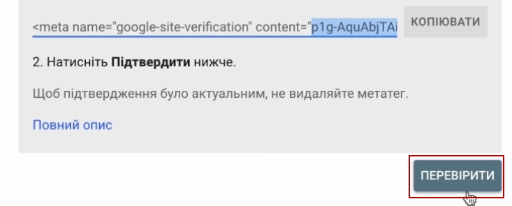 Он дальше даже обновит эту информацию. Он подставит только эти символы, код подтверждения, который там был между этим знаком равен. Вот и все. После этого мы возвращаемся в Search console. «Проверить» нажимаем.