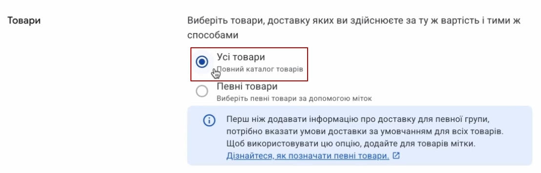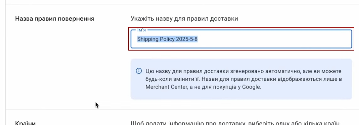 Один важный нюанс, только помните, что условия возврата сами по себе проверяются отдельными модераторами, ручными. Пока что Google это не автоматизировал, к сожалению. Условия возврата на блокировку вашего Мерчант центр-у, само заведение этих условий возврата в середину Мерчант центра не влияет. Если вдруг вы напуганы тем, что Google блокирует магазины по разным причинам… Если нужно вам отдельное видео по тому, что является причиной, что не является причинами для блокировки, напишите мне, но сейчас незаведение этих условий не будет негативно влиять на вас. Мы добавляем сейчас доставку и потом перейдем к добавлению товаров.