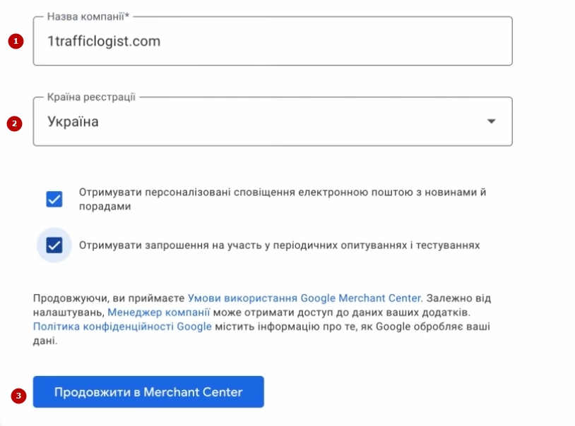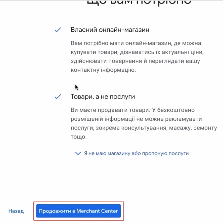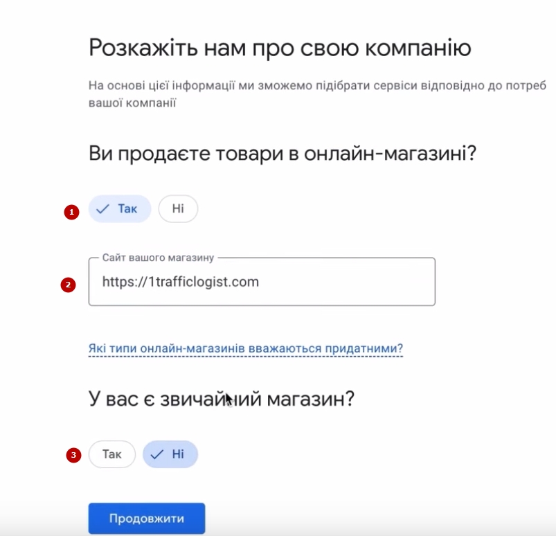 Сама настройка кабинета Мерчант центр не сложная. Отвечаем на вопрос, продаем ли мы какие-то товары. Да, продаем. Сайт нашего магазина указываем. «Обычный магазин». Нет, у нас нет. Нажимаем «Продолжить».