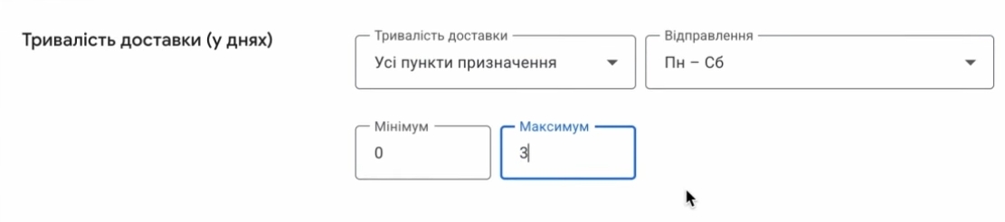 Продолжительность доставки — это срок этой доставки. Если у нас есть заказы, которые отправляются день в день, мы оставляем нолик. Если у нас доставка до трех дней, мы можем написать 0, 2 и это будет правильно. Новая почта, обычно, у нас быстрее всего доставляет 1-3 дня.