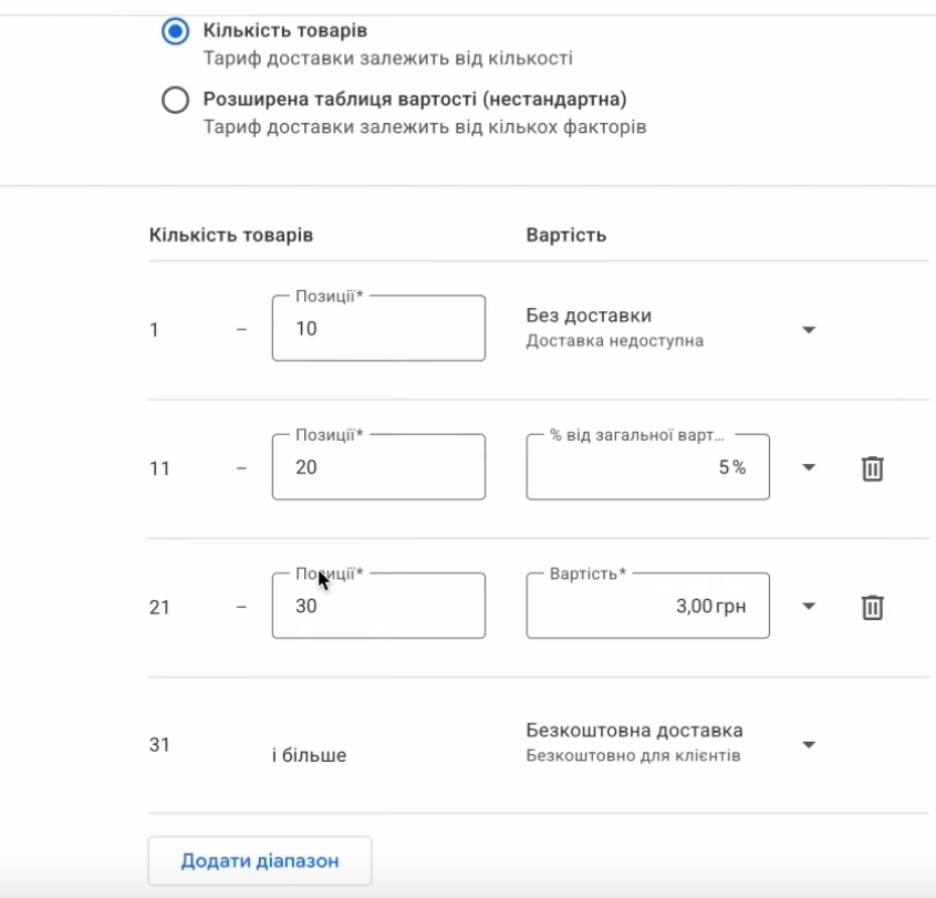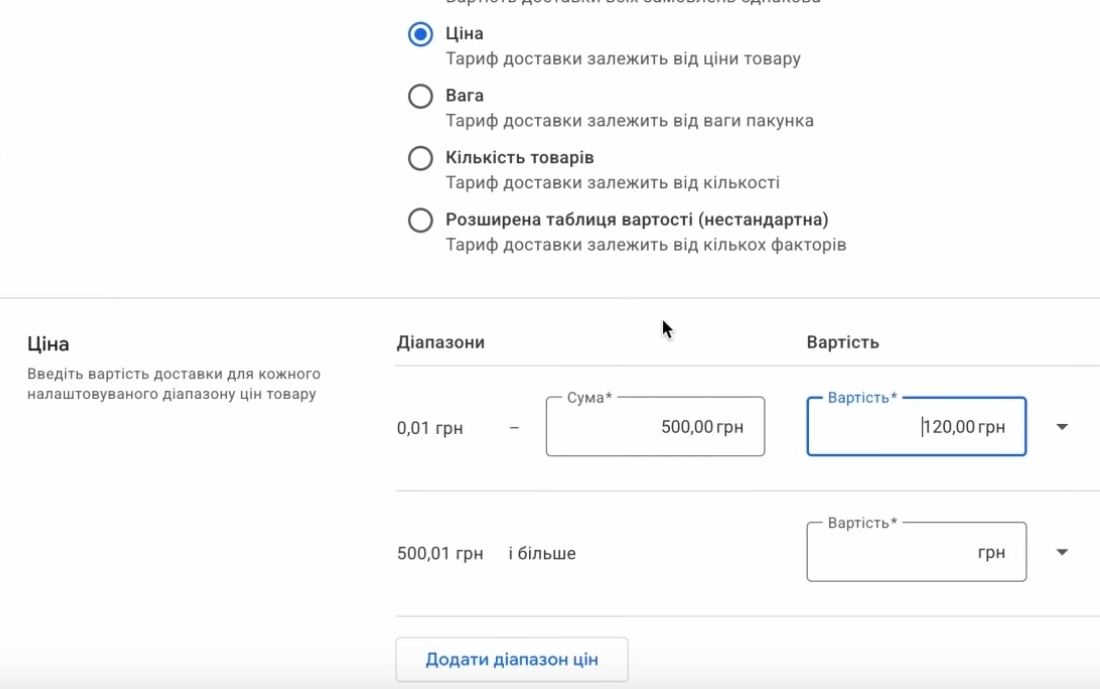 Если от цены зависит что-то, это также очень удобно настраивать. Например, товары до 500 грн вы доставляете за 120 грн, если больше или вам нужно 500 — полторы и погнали дальше.