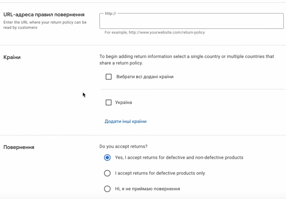 Условия возврата. Смотрите, они также не сложны. Вы можете добавить их позже. Рекомендую добавить их позже. Здесь требуется URL-адрес возврата. Выбрать страны, получаете вы или не получаете эти возвраты, несложно. Вы с этим справитесь. Я даже останавливаться на этом не буду. Идем дальше.