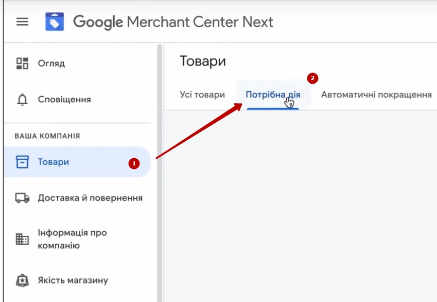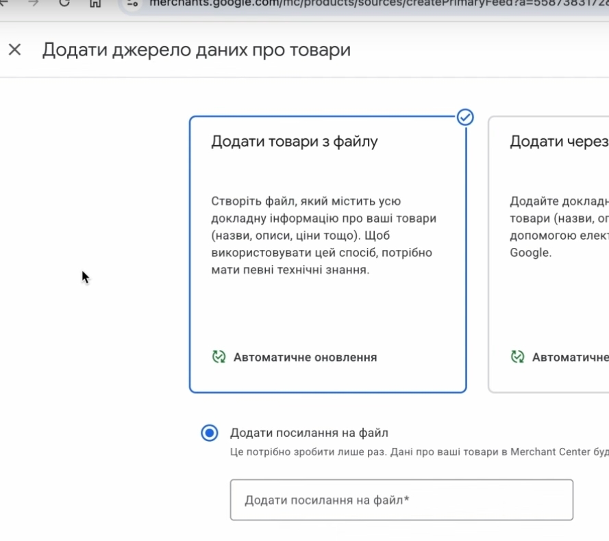 Добавьте товары. Как мы будем добавлять товары? Мы будем добавлять товары. Даже не так. Как можно добавить товары, залить фид для Мерчант центра на prom.ua? Очень легко, друзья. Мы будем заливать с вами по ссылке на файл. Формат у нас будет xml-овский.