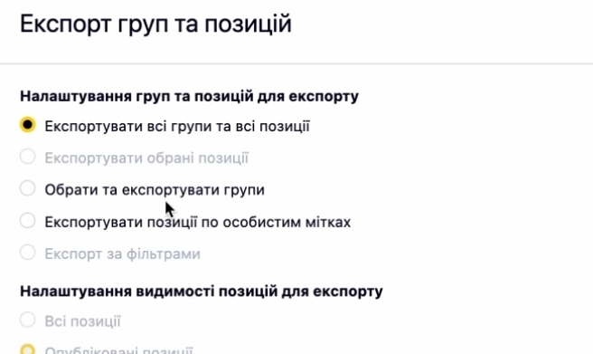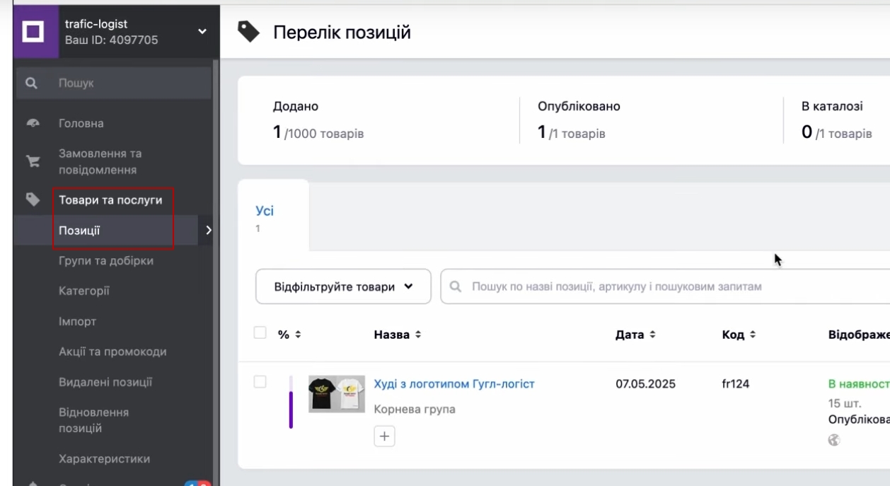 Осталось нам добыть эту ссылку. Где нам ее добыть? Заходим в «Товары», наши «Позиции». У меня всего-навсего одна товарная позиция несчастная, но у вас может быть их много. Нажимаем «Экспорт».