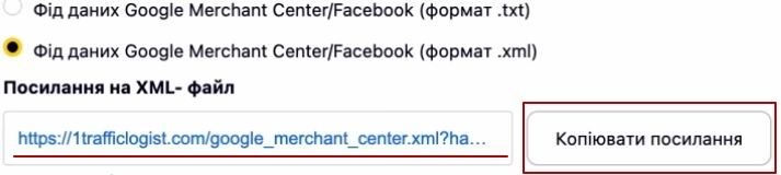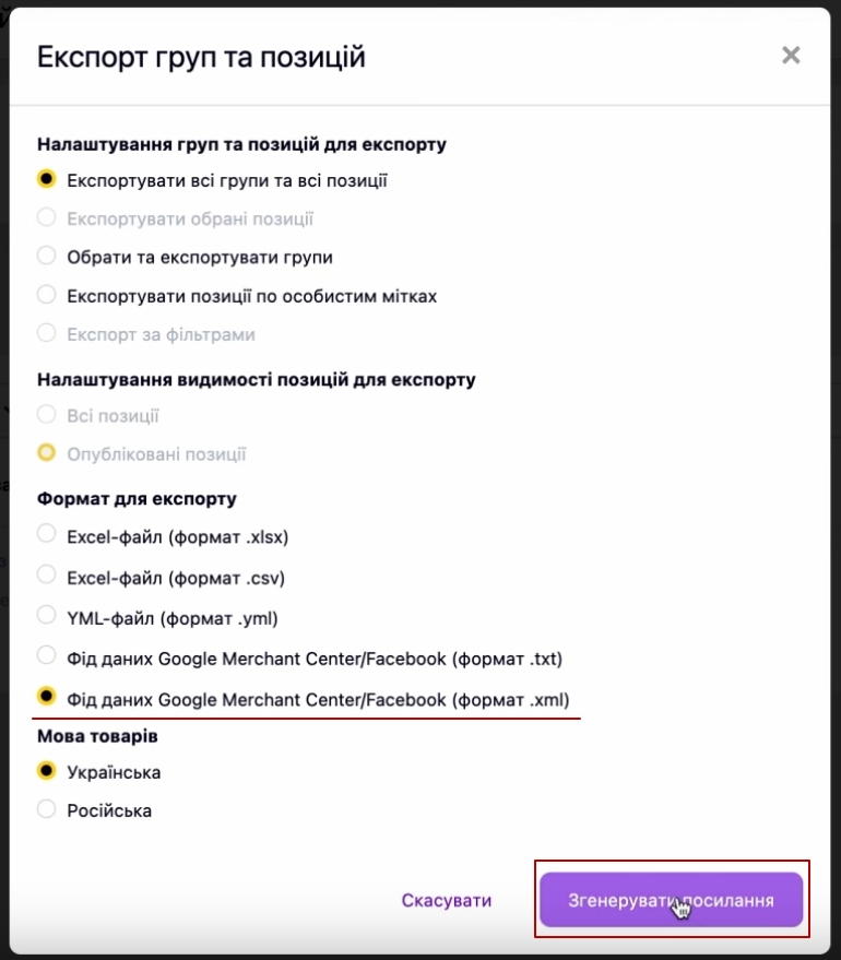 Выбираем фид данных Merchant XML. Выбираем языковую версию товаров. Если у вас две языковые версии, можете выгрузить две языковые версии. Если вы сомневаетесь нужен ли вам русский язык, или вообще у вас его нет, не парьтесь, украинского языка сейчас будет достаточно. Будет прекрасно работать ваш рекламный кабинет. Нажимаю «Сгенерировать ссылку».