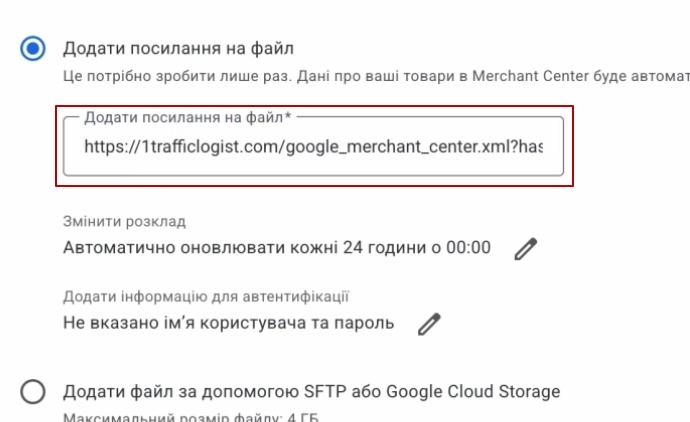 Возвращаемся в наш Мерчант центр. Вставляем нашу ссылку в том виде, которое нам сделал Пром. Нажимаем «Продолжить».