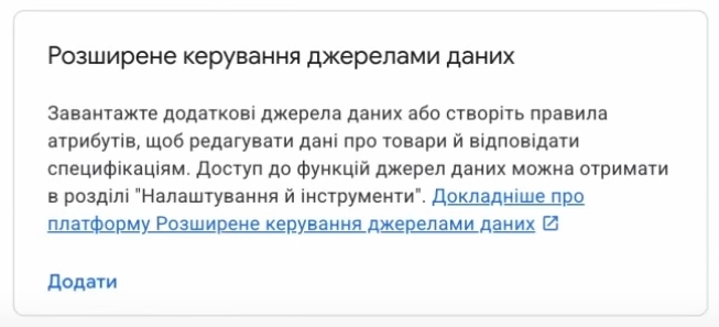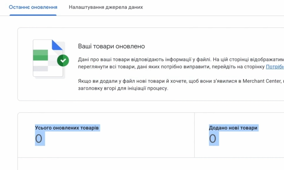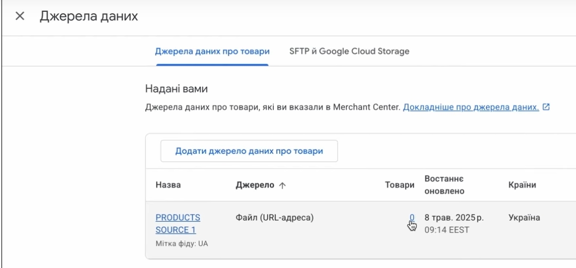 Если вдруг вышли из этого блока и вам нужно вернуться, понять, добавились ли товары, нажимаете с правого вверху шестеренку, «Источники данных». И здесь будет этот фид или набор фидов, которые вы загрузили. Пока что у меня здесь ноль отображается.