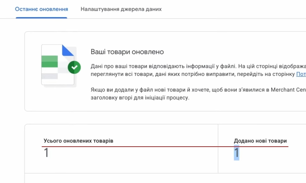 Нажимаю на этот фид. Видите, у меня уже показано обновленных товаров. Добавлен один товар, потому что он у меня один-единственный. Важно, чтобы здесь появилась эта циферка «Один». Тогда можем считать действительно успешной эту заливку товаров. Сейчас подождем, чтобы я вам показала, что товар появился, какие на нем статусы и прочее.