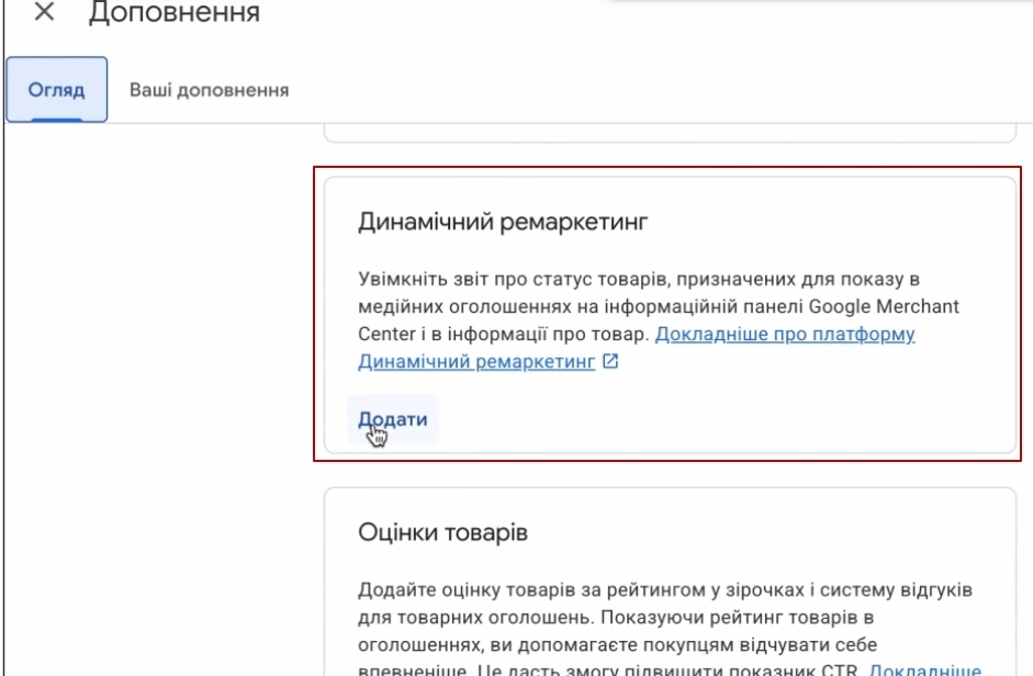 Но пока товары заливаются, предлагаю добавить еще несколько важных настроек в ваш Мерчант центр. Они вам точно не сделают хуже. Мы добавляем динамический ремаркетинг, этот блок.