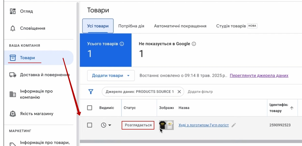 Возвращаемся в наши «Источники данных». Мы уже видим у нас один товар. Мы нажимаем на него. Он появляется уже на вкладке «Товары». Видите, статус пока что «Рассматривается».