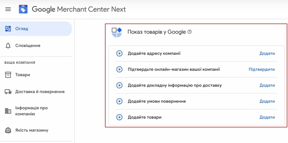 Далее у нас создастся сам аккаунт Мерчант центр-а. Сразу предложат перечень вещей, которые нам стоит с вами сейчас будет сделать для того, чтобы подтвердить магазин. Не подтвердить, а залить товары и пройти проверку.