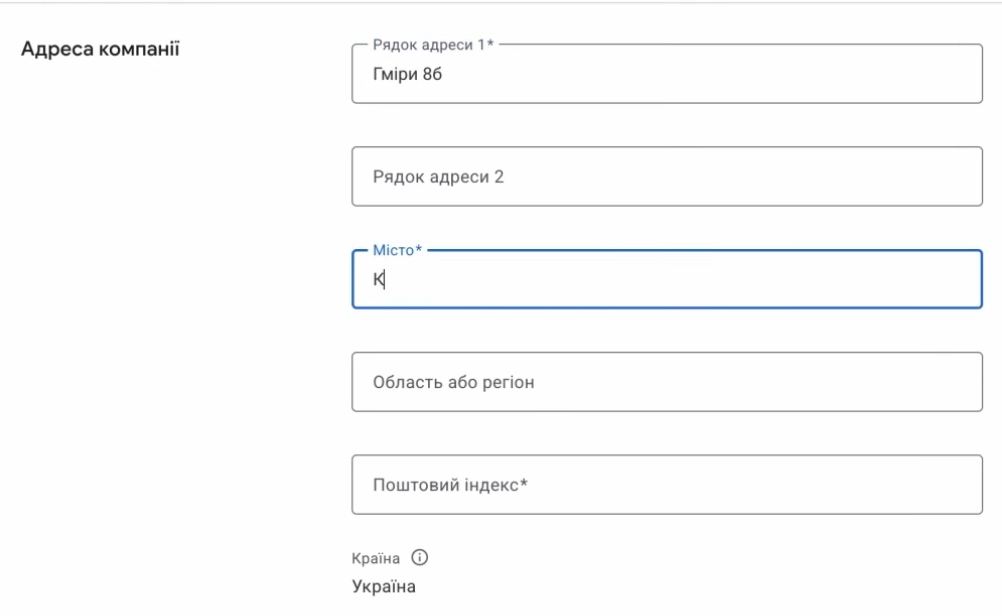 С чего мы будем начинать? По инструкции этой мы будем идти. Здесь не сложно, но важны следующие этапы. Адрес компании. Я надеюсь, что вы сможете перенести все то, что у вас есть на сайте. Да, помните, что Киев — это отдельный административный регион. «Продолжить». Адрес у нас уже готов.
