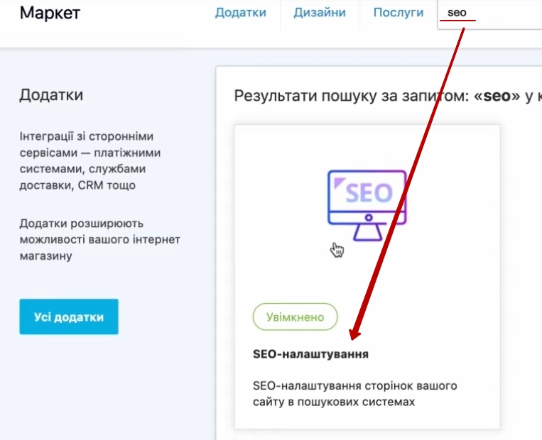 Далее нас просят подтвердить онлайн-магазин вашей компании. И это будет также максимально легко на Пром-и. Почему? Потому что сейчас покажу, как это будет происходить. Нам нужно зайти в нашу админку сайта, найти вот такой блок, который называется «Инструменты веб-мастера и СЕО». Если вдруг их нет, вы заходите в маркет, нажимаете «Добавить приложение». Здесь вписываете «SEO», оно будет одно единственное.
