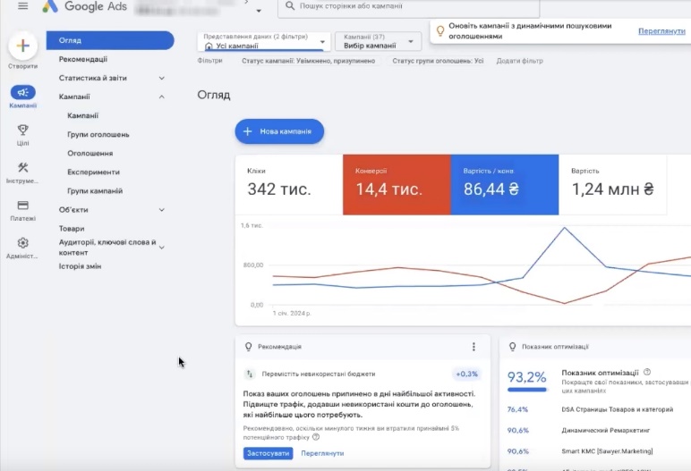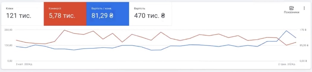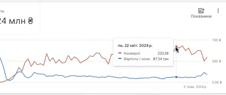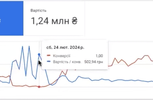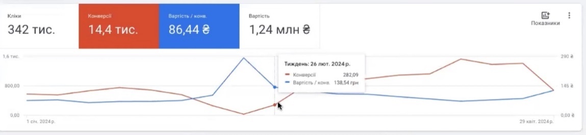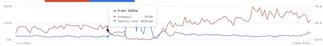 Просто здесь статистики много, потому это скорее происходит. Например, до 70 грн., затем снова 166 и вот уменьшение цены за конверсию при том, что увеличилось количество конверсий здесь видно. Это чисто покупки, это не какие-то еще левые конверсии. Здесь аккаунт идет чисто на покупках, то, что я очень люблю. Это не сложные проекты, где нужно добавлять еще что-то. Но здесь также техническая база по настройкам верна, корректна была сделана, отредактирована техническая сторона тегов правильная корректная работа.