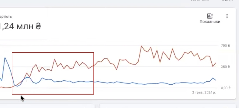 То есть не довести до таких вот проседаний кардинальных. Видите вот, например, 500 грн. одна продажа. 600 грн. там 1,77 конверсия. 5 за конверсию 629 грн. То есть пять продаж, каждая из них по 629 грн. Это тематика у нас автозапчасти. Я думаю что все кто знаком с автозапчастями — для них это не подъемные цифры, это надо по какой стоимости продавать запчасть чтобы отбить эту всю историю. То есть грамотный специалист может справиться с этим всем и стабилизировать это в максимально сжатые сроки. Потому что если ничего не менять, например, предположим что специалист не понимает что он делает то будет примерно вот так. А вот работа грамотная специалиста когда это все пробуют стабилизировать, доводить до определенного более-менее адекватного уровня картинки которой можно и расти в штуках и при этом плюс-минус сохранять цену за конверсию или окупаемость которую требует клиент. Это у нас тематика автозапчастей для различных машин. Не буду достаточно уточнять потому что плюс-минус все конкуренты между собой, стратегию показывать не буду.