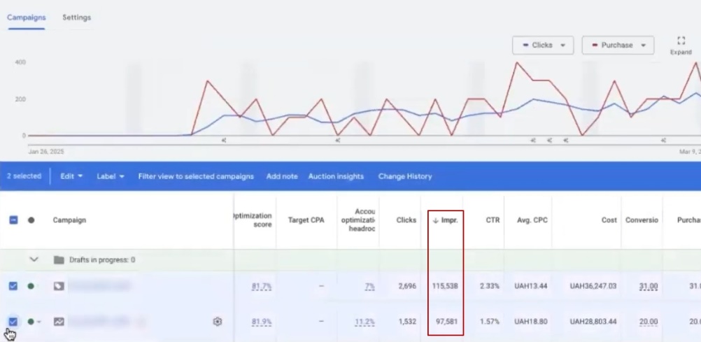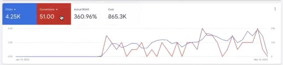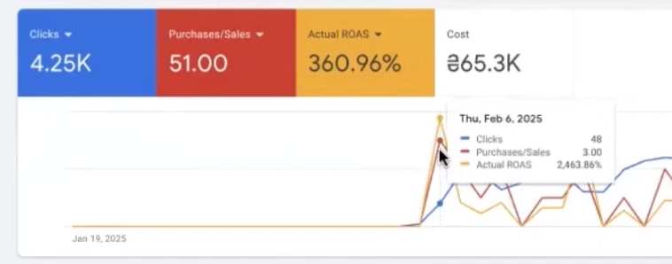 И здесь в показах даже видно, что показы изменились, хотя клики сохранялись в основном каком-то блоке. Можно увидеть, что покупки здесь действительно не суперстабильные. В отличие от Пмакс-а, видите, возможно это то, что я смотрю все кампании, правильно? Pmax действительно очень медленно раскачивался, медленно собирал аналитику, но также есть свои нюансы.