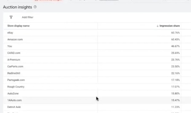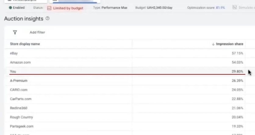 Есть ли такая же аналитика в Пмакс-ах? Можем сейчас взглянуть. Статистика аукциона. Как видите, поиска здесь нет. Это типаж кампании Feed Only. Также у нас достаточно низкий процент.