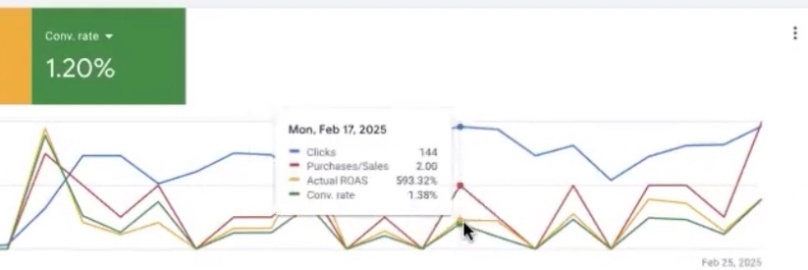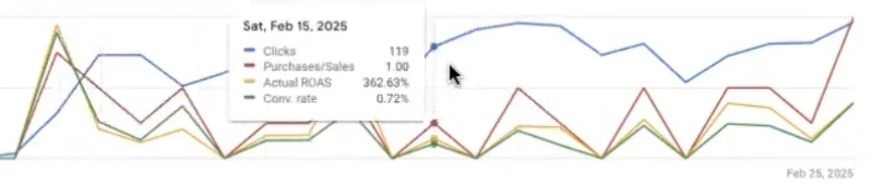 Ну и здесь не видно, что коэффициент конверсии удержался. У нас трафика стало больше, в первую очередь из-за того, что большее количество товаров вышло в аукцион, вышло в показы. Большая часть была откручена. Также эти прострелы с conversion rate нам показывают насколько жесткие или слабые стратегии ставок мы выставили для данного аукциона. Это также один из таких важных нюансов. После этого промежутка времени у нас ROAS упала. Видно за последние 7 дней. Возможно она немножко подтянется, потому что все-таки конверсии попадают запоздалые. Здесь видно, что еще на одном простреле у нас ROAS существенно упал.