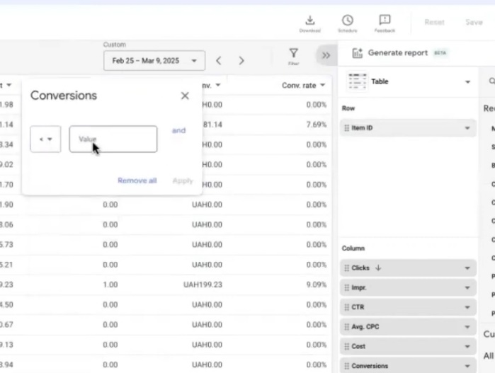 Как это можно проверить? Вы можете это самостоятельно в своих аккаунтах сделать. Зайти в отчет по шопинг продуктам, взять те же самые item ID и взять какую ситуацию? Вы можете взять конверсий меньше единицы. Только обратите внимание, что у меня модель атрибутции «последний клик», поэтому у меня нет половинчатых конверсий. Вы смотрите уже по своему. И берем затрат больше 20 гривен. Берем 20 грн, поэтому 300 товаров по 20 грн — это также сумма расходов, которую вы несете. Не супер критично в данном контексте, но пусть будет.
