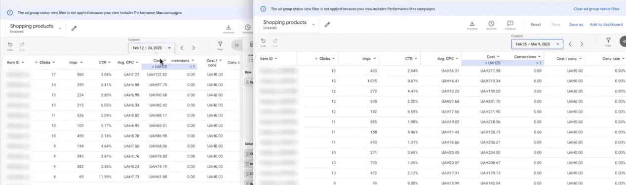 Теперь смотрим, уравниваем расходную часть. Что мы можем увидеть? Это будет не достаточно корректно здесь уравнивать. Надо будет вот таким вот образом или сделать вам два окна. Давайте зафиксируем. 36000 грн. Правильно? Берем промежуток времени. Если мы уравняем, это 12-е — 24-е. Теперь 12-е — 24-е. 6,000 грн. То есть у нас рентабельность по факту упала не потому, что Пмакс-ы что-то неправильно сделали, что-то кардинально там глобально изменилось. Нет, мы просто действительно сделали достаточно существенный прострел трафика. И этот прострел трафика в первую очередь был связан с тем, что большая часть товаров вышла в показы. Если мы возьмем там пятое, второе, девятое, например, мы можем увидеть, с 25-го у нас был прострел. Вот, например, 25-е — 4-е уравняем. Здесь не будет корректного уравнивания, потому что мы я же отбираю по конверсиям в разных периодах разный набор конверсий.