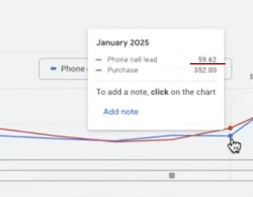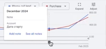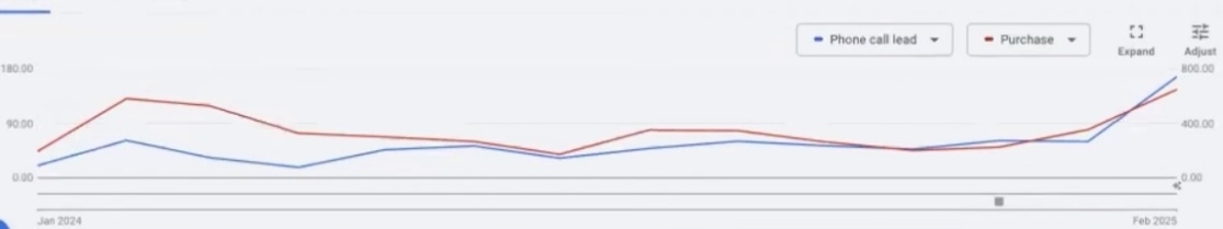 Итак, мы имеем 580,80. В феврале 2025 года мы имеем 648 и 167 phone call лидов. Даже если мы на звонки не ориентируемся, 648 и 580 кажется, что не так много. Но если мы проведем анализ по дням и увидим по ID-шникам, например, реальное количество конверсий, а я бы хотела вам их продемонстрировать, то здесь их может полноценных, полных конверсий быть значительно меньше.