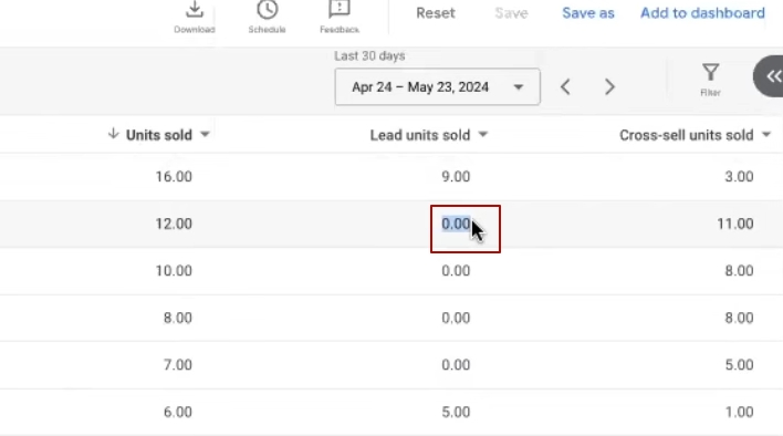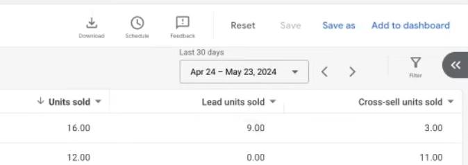Что мы видим? Мы здесь видим следующую картинку. Я вот расшифрую, что значит эти столбики у нас. Здесь есть Units sold, Lead units sold и Cross-sell units sold. Что они означают? Я буду оперировать примерами, которые приводит Google, потому что, скорее всего, так будет даже гораздо проще.