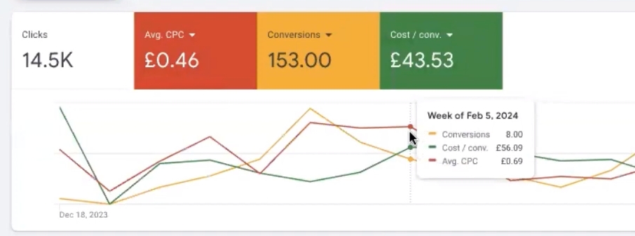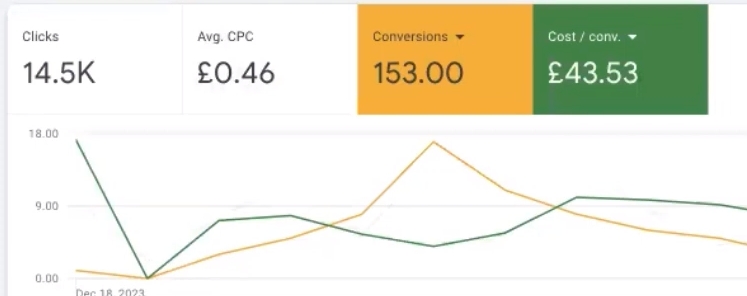Из-за подобных нюансов нужно нарастить количество конверсий и удержать плюс-минус цену за конверсию, хотя бы до 40 фунтов. Показываю 43 в среднем. Есть колебания, где дороже цена за конверсию непосредственно. Сейчас рассмотрим.