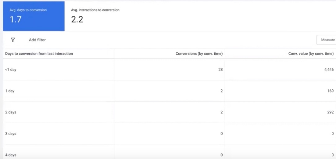 Следующее. Сам рынок Великобритании, он достаточно специфический в модели поведения перед покупкой. В проекте могу показать отчёт по атрибуции интересный. Рекомендую, регулярно заглядывать в данный аккаунт. Взяла апрель двадцать четвёртого года. Что тут можем увидеть, если выберете соответствующие конверсии? Среднее количество дней до конверсии и среднее количество взаимодействия до конверсии.
