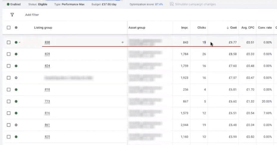 Итоговое значение в этой кампании нарисовано как 79 фунтов. А 79 так как в категории есть товары, что… Как видите, нет какого-то супер слива денег. Это 10 фунтов за 2 недели или за неделю потратил. Восемь, ну почти девять. Семь, ну, допустим восемь, ещё восемь. Накапливается и получается, что дорогая цена за конверсию. Для удешевления в общем, приходится существенно работать дохватами. Плюс в однотипных товарах у перформанса есть большой соблазн делать следующую вещь.