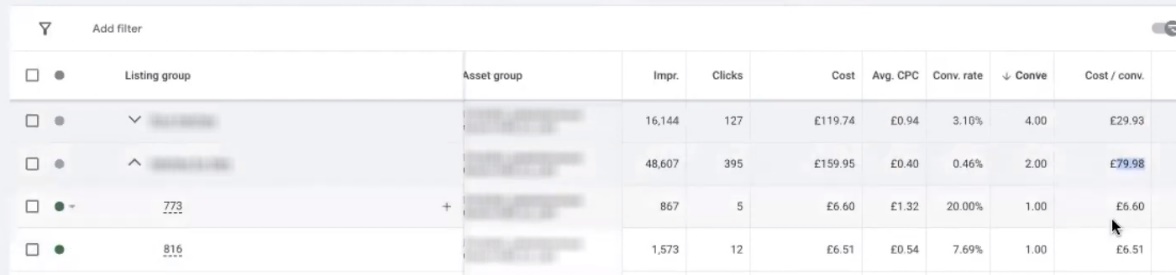 Данная группа товаров работает достаточно длительное время. Допустим, больше недели работает. CPCшка неплохая, но видите с 19 кликов — ноль конверсии. С пяти кликов уже есть конверсия. Ниже стоимость за конверсию, нежели 40 фунтов, что просил клиент безусловно – да. Как и эта конверсия или, допустим, если отфильтрую по конверсиям, видите — 6. Допустим данная категория даёт, допустим шесть.