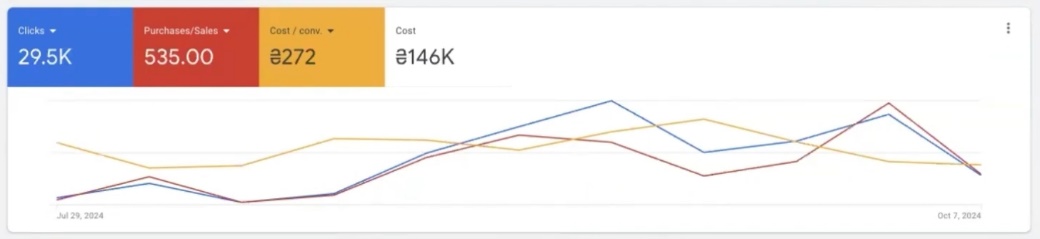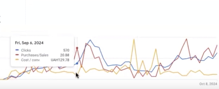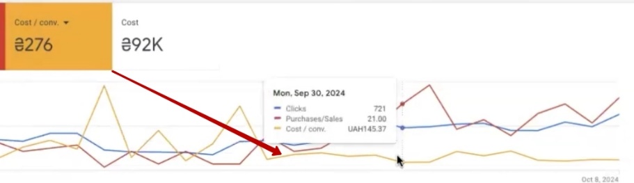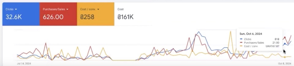 Здесь вы можете увидеть не очень хорошие цифры — 50-60 грн за продажу. Но есть возможность подняться до 21, и цена за конверсию будет дороже. Мы, так сказать, поднимаемся. Надеюсь, что эта динамика сохранится, потому что продаж было действительно, вроде бы, много, но цена за конверсию довольно дорогая. И это было самым проблемным моментом. Как только мы начали…