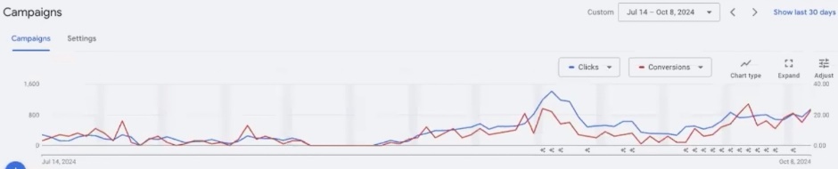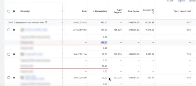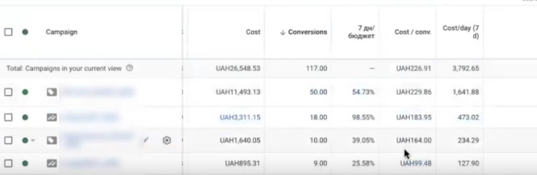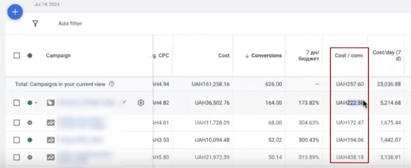 Даже если я сейчас возьму первое и просто возьмем недельку, чтобы была видна динамика. Реально эта цена за конверсию — ей было настолько трудно. То есть, как будто конверсии наращиваешь, а они прямую корреляцию затрат, Google все больше тратил.