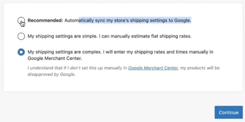 Желательно, если сайт, что продаёт за границу, автоматически синхронизировать все шиппинг настройки. Допустим, захотите вручную задать. Допустим, захотите задать шиппинг настройки (Shipping settings) непосредственно в Мерчант центре. Для Украины это желательно, возможно есть какая-то система глобальная позволяющая высчитывать стоимость доставки, есть какая-то интеграция со службами доставки. Для Украины абсолютно не ошибка, если выберете, допустим, что заполните шипинг рейты или временные какие-то промежутки вручную в Google Мерчант центре. Существует прямая интеграция со службами доставки, если продаёте где-то в Европе, в Австралию, Канаду, Штаты просто выбираете блок Recommended. Дальше Continue.