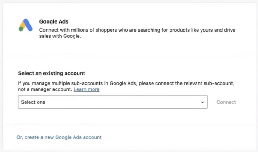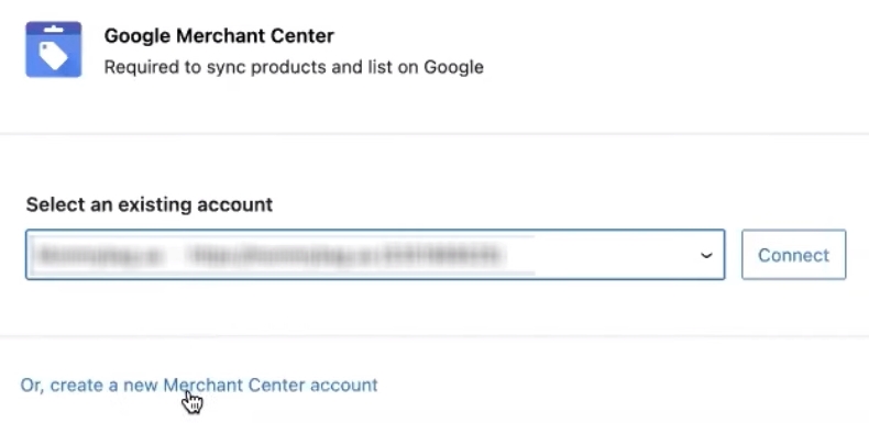В моём случае выбираю уже existing account. То есть существующий аккаунт, его выбрала, нажимаю Connect. Эта штука похожа на функционал на Shopify. Если пользовались на Shopify плагином Google Channel от Гугла, то примерно такая же история происходит. То есть просто коннектим два сервиса между собой или возможность создать новый Мерчант центр.