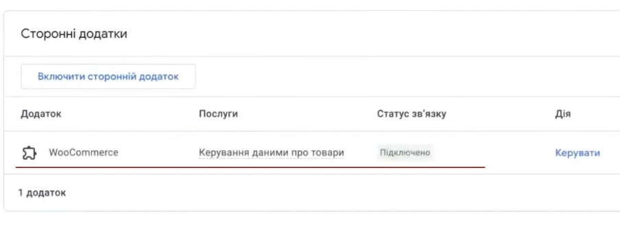 Примерно такая же связка будет и, непосредственно, в самом Мерчант центре. Если посмотрим различные настройки. В «Приложениях и сервисах» уже появился Woocommerce «управление данными про товары» и, соответственно, можем этой историей пользоваться.