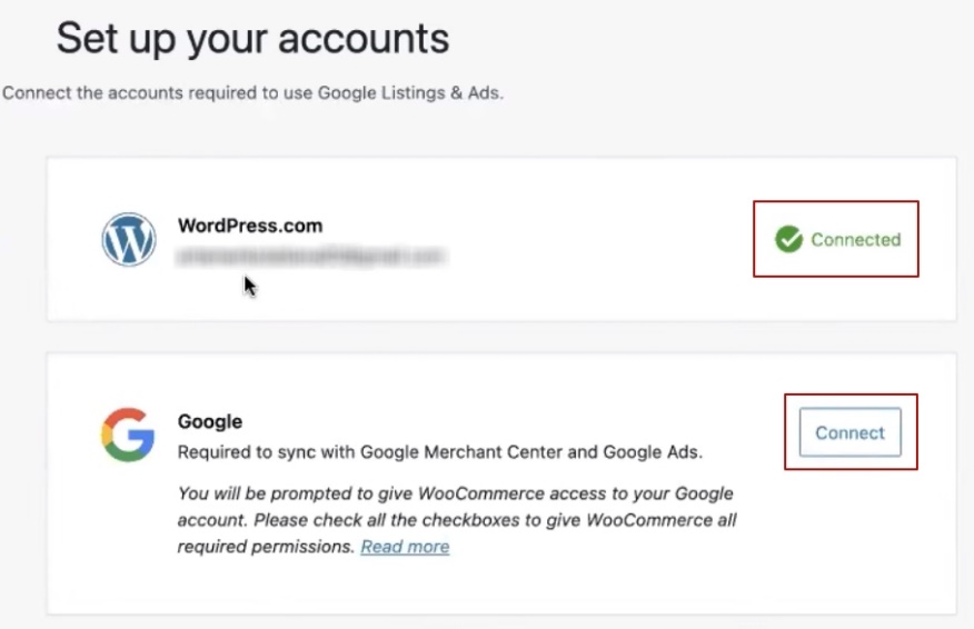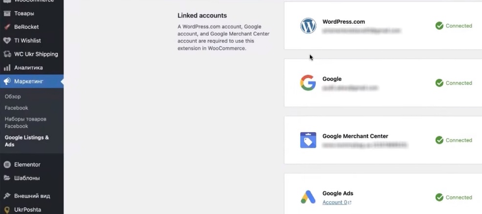 Есть. То есть сейчас как должны выглядеть базовые настройки в данном плагине. То есть подключены, связали плагин, подтвердили связку с WordPress-ом. Дальше подключили Google email аккаунт через который можно заходить в Google Ads и, непосредственно, в Мерчант центр. В Google Ads можете потом любой подвязать или Merchant Center, который нужен под любую из почт.