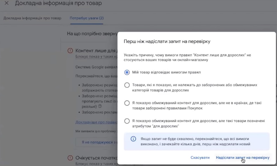Видите, как контент для взрослых, то есть нужно будет потом апеллировать на эту историю. Это ещё рано делать. То есть показываю вариантами что можно сделать, но уже видно что необходимо дождаться проверки трёхдневной, чтобы был блок информации адекватный о том с какими товарами существуют проблемы, с какими проблем нет, нужно ли что-то править в сайте или нужно править в каких-то карточках товара. Видите как перекис водню (перекись водорода), здесь тоже охрана здоровья, то есть оно якобы его не должно пропускать в рекламу, но дождемся полностью всей нужной информации.