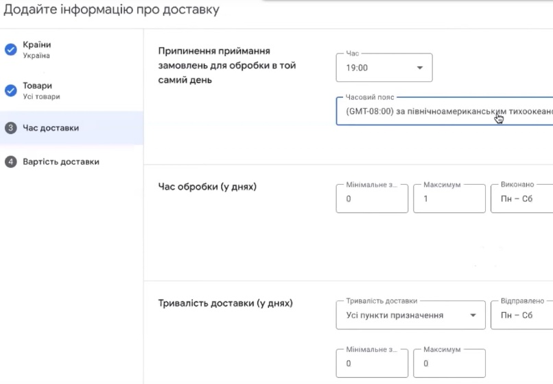 Google просит дозаполнить доставку. Помните, выбрали формат, когда задаём доставку вручную (Manualy), а не выгружаем информацию автоматически с сайта. Желательно зайти на сайт, посмотреть что написано про доставку и оплату и, соответственно, уже дальше внести изменения непосредственно в Мерчант центр. Это делается несложно. Нужно добавить страну. «Продолжить». Желательно обязательно это сделать, так как блок прям ругается в системе. Что нужно сделать? Время, до которого принимаем заказ. Нужно посмотреть если приём какой-то по времени товара нет, поэтому, можем дописать что до 19-00.